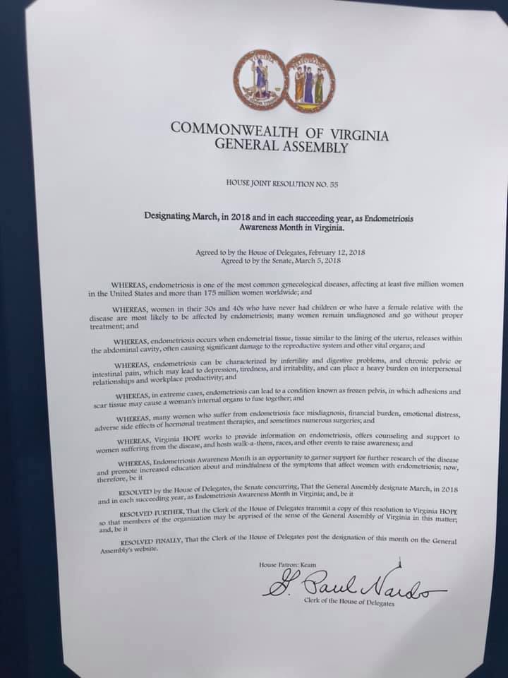 Earlier this year, the Virginia General Assembly passed a resolution designating March as Endometriosis Awareness Month in the state of Virginia. Today, Delegate Mark Keam presented that resolution to us, giving his support not only to our mission for awareness and education, but to all women with endometriosis. Thank you so much Delegate Keam, Virginia lawmakers, and Governor Northam for your unwavering support of our cause. A special thank you to our co-founders Ronda Payne, Chandelis Duster, and Judy Mitchell for your vision of hope and passion to uplift women suffering with this painful disease. And thank you VA Hope volunteers, fellow endo sisters, Worldwide EndoMarch Headquarters, The Endometriosis Foundation of America, and families for your strength and encouragement. One day we will find a cure and we will do it together.