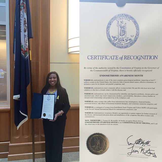In March of 2015, Governor Terry McAuliffe declared March as Endometriosis Awareness Month in the commonwealth of Virginia. This was a first for endometriosis awareness in Virginia and a huge accomplishment for those with endometriosis. Governor McAuliffe also declared March Endometriosis Awareness Month in 2016.